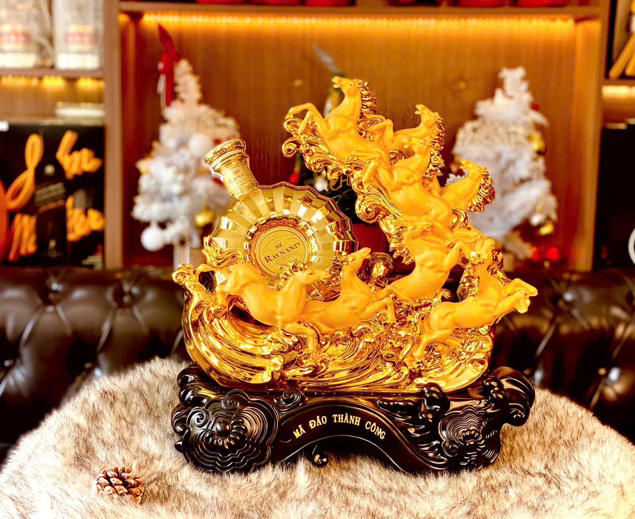 Sức hấp dẫn của kệ rượu 8 ngựa Mã Đáo Thành Công đến từ sự kết hợp hoàn hảo giữa ý nghĩa phong thủy uyên thâm, nghệ thuật điêu khắc tinh xảo và sự đẳng cấp của chai rượu Brandy XO Pháp đi kèm.