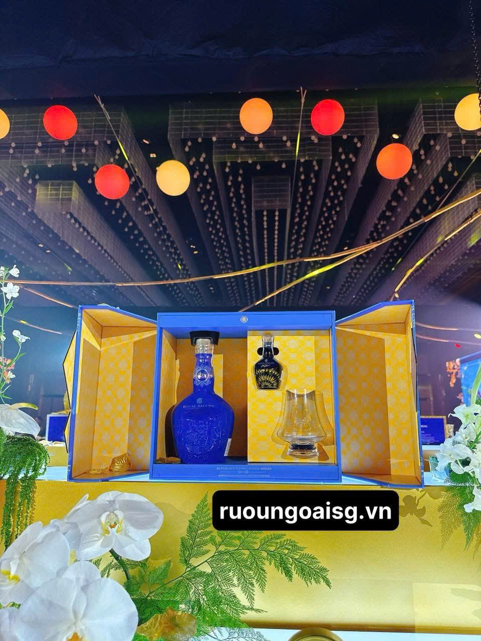 Ở trung tâm là chai Royal Salute 26 với chất liệu sứ thủ công cao cấp, mang sắc xanh sẫm sâu hút như đại dương, điểm xuyết bằng tem vàng nổi bật. Bên cạnh đó là ly bạc hoàng gia được đặt riêng trong khay, hoàn thiện trọn vẹn trải nghiệm thưởng thức – không chỉ là món quà mà còn là nghi thức sang trọng dành cho những người trân quý.
