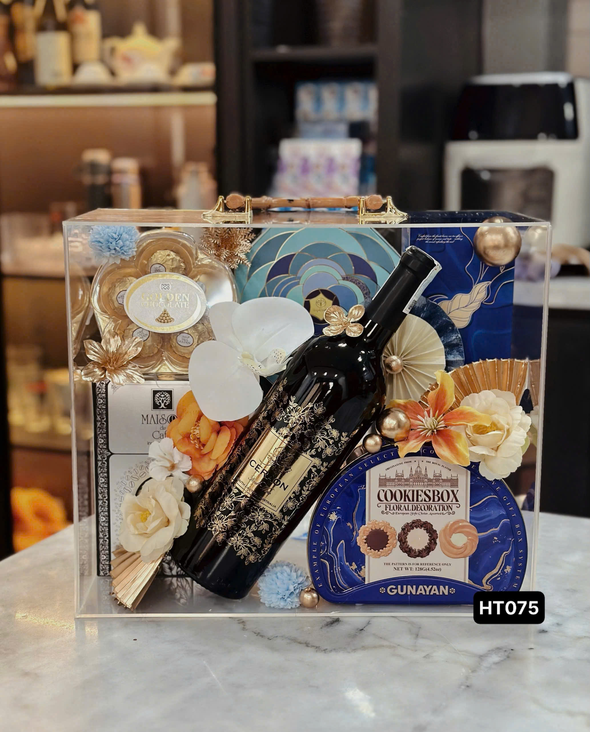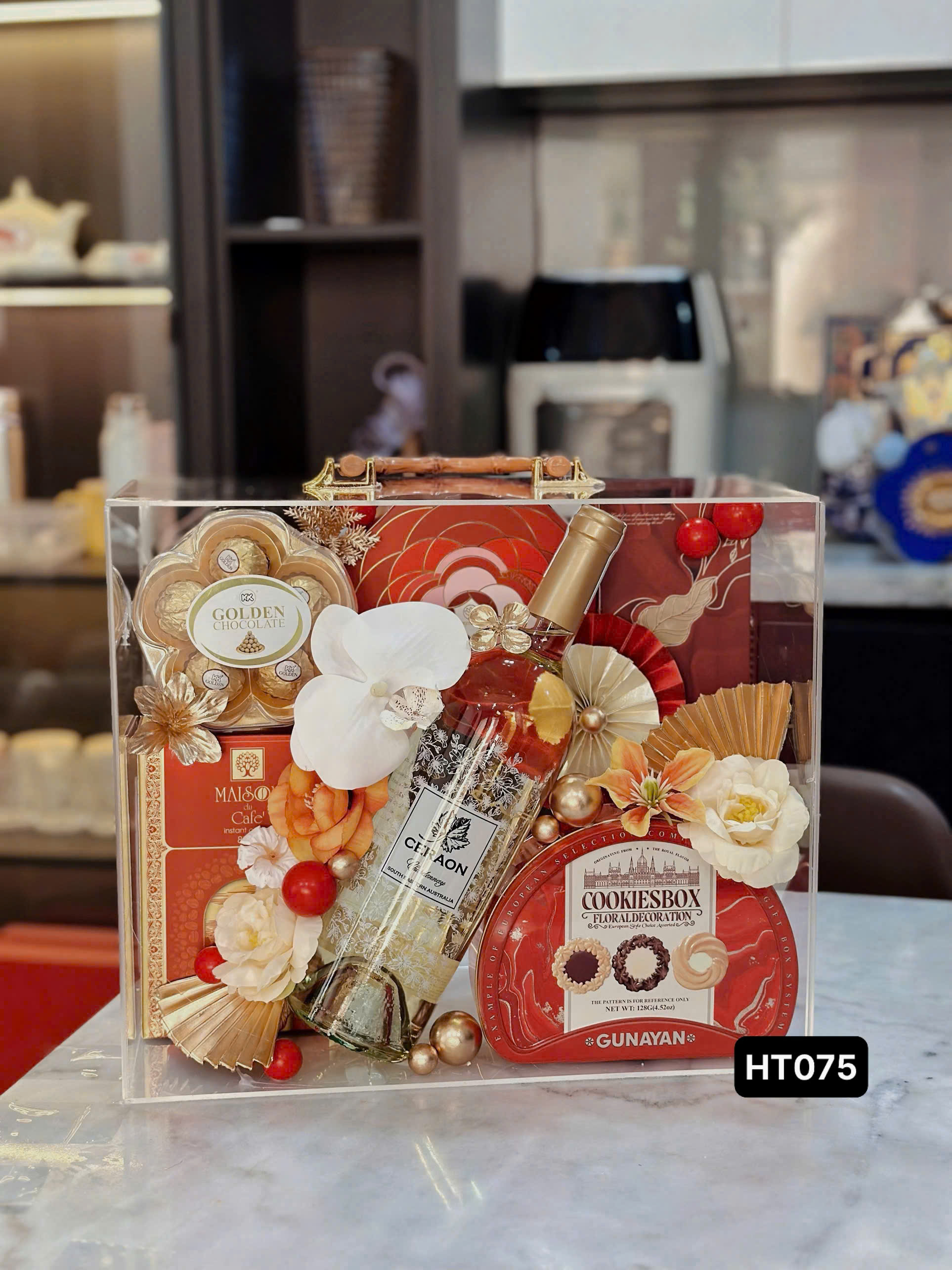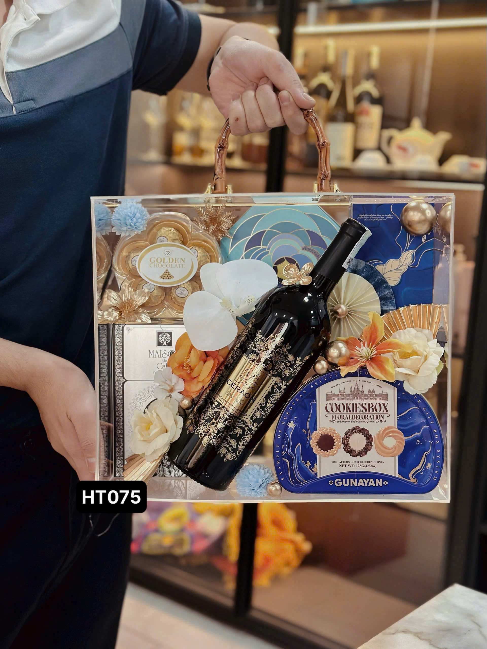 Set HT075 gồm : 1 rượu vang 1 Cookies box 1 cafe Maison 1 Scl Golden 1 trà Lotus 1 chocolate