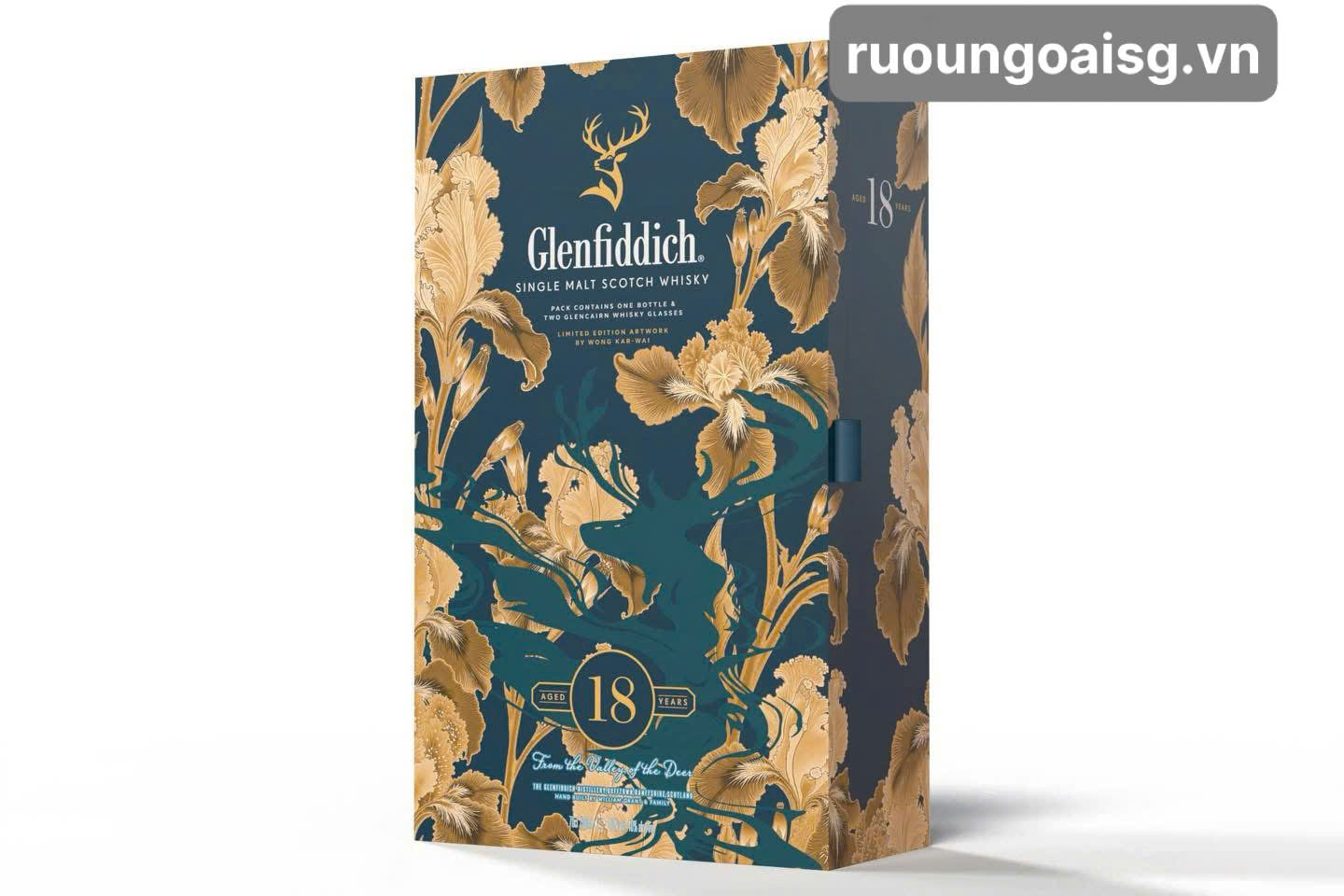 Hộp quà sử dụng tông màu chủ đạo là Xanh ngọc/Xanh rêu đậm quý phái, kết hợp với các họa tiết Vàng kim tinh xảo và phức tạp. Hình ảnh đầu hươu biểu tượng Glenfiddich được chạm khắc nổi bật, xen kẽ với hoa văn mang tính nghệ thuật cao. Thiết kế không chỉ là bao bì mà còn là một tác phẩm nghệ thuật, thể hiện sự thịnh vượng, may mắn. Đây là món quà hoàn hảo để thể hiện sự kính trọng cao nhất.
