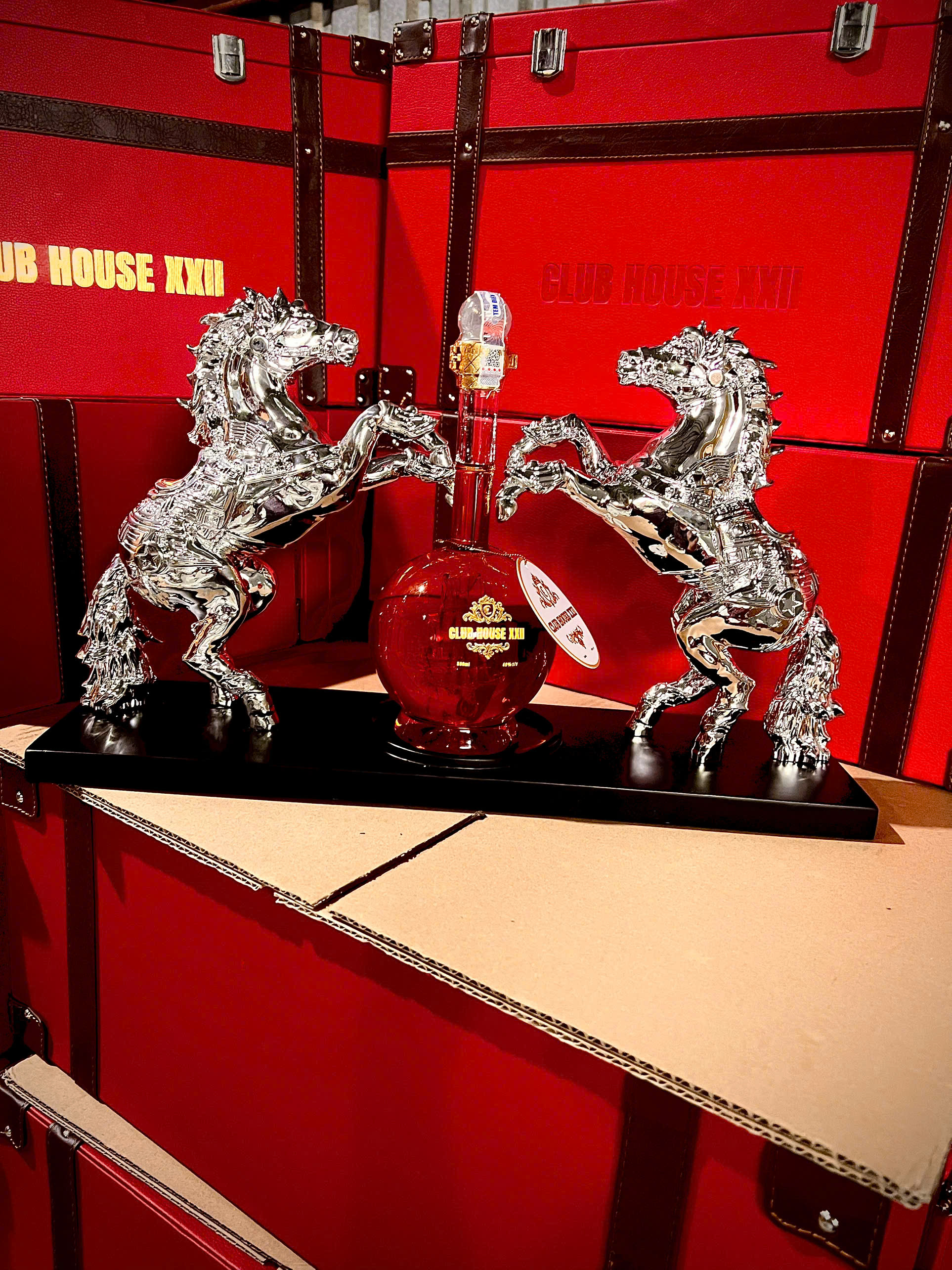 Club House XXII – Ngựa Đôi Song Mã là tuyệt tác kết hợp giữa whisky Pháp thượng hạng (500ml – 40%) và nghệ thuật chế tác kim loại phủ vàng đồng cổ ánh kim. Đây là chất liệu độc bản, chưa từng xuất hiện trên thị trường rượu linh vật Việt Nam.