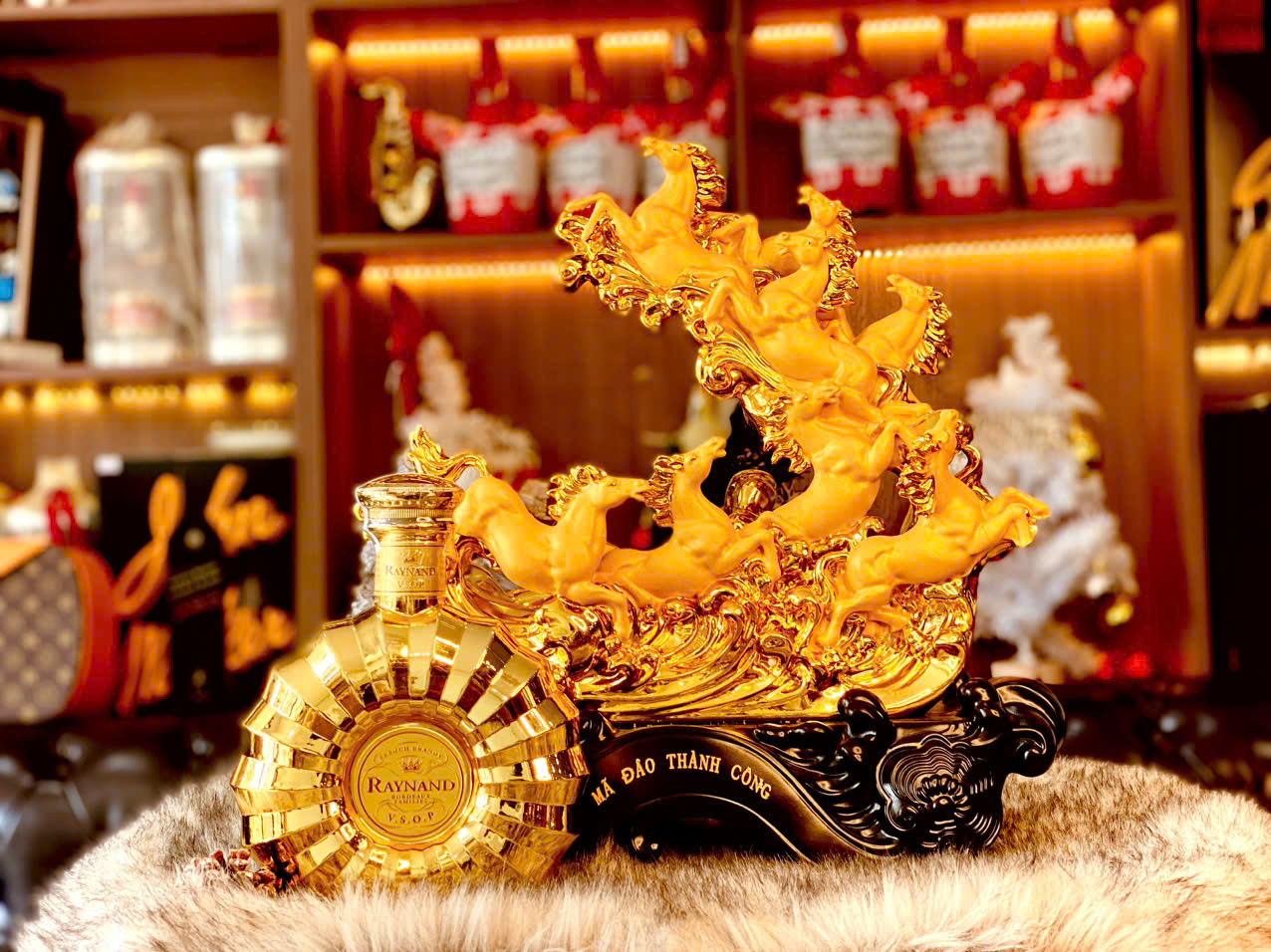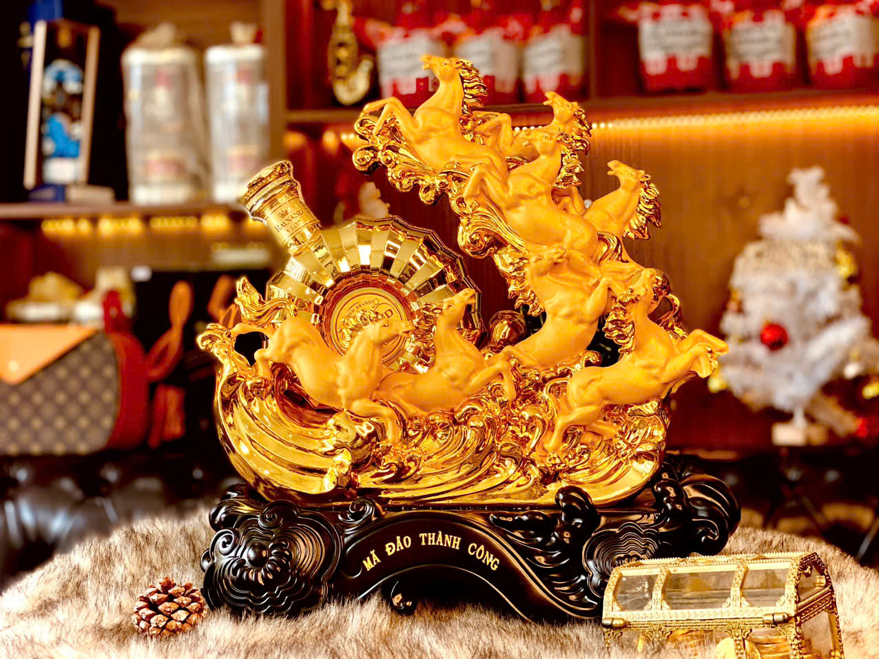 Sức hấp dẫn của kệ rượu 8 ngựa Mã Đáo Thành Công đến từ sự kết hợp hoàn hảo giữa ý nghĩa phong thủy uyên thâm, nghệ thuật điêu khắc tinh xảo và sự đẳng cấp của chai rượu Brandy XO Pháp đi kèm.